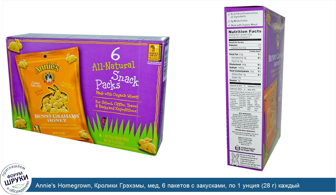 Друзья, если у вас есть отзыв/дополнение/комментарий/вопрос относительно Annie's Homegrown, Кролики Грэхэмы, мед, 6 пакетов с закусками, по 1 унция (28 г) каждый - напишите его ответом в эту тему (это будет полезно всему сообществу в целом и вам в отдельности).