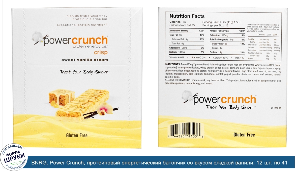 ru BNRG, Power Crunch, протеиновый энергетический батончик со вкусом сладкой ванили, 12 шт. по 41 г