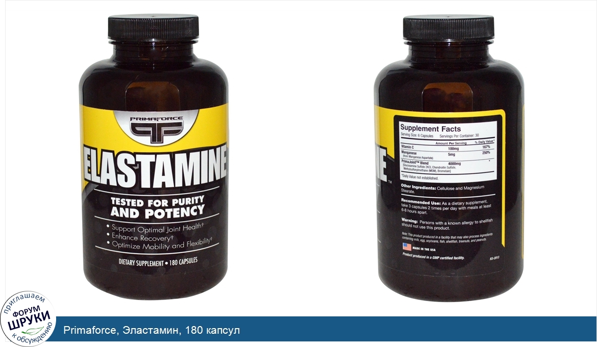 [DESCRIPT]Tested for Purity and Potency. Support Optimal Joint Health. Enhance Recovery. Optimize Mobility and Flexibility. Dietary Supplement. Product Produced in a GMP Certified Facility. Elastamine contains Glucosamine Sulfate 2KCl along with the advanced PrimaJoint Blend which contains MSM, Chondroitin Sulfate and Bromelain. Vitamin C and Manganese Aspartate are added for additional joint health support. Exercise, injury and age can all cause wear and tear on your body. The clinically proven ingredients in Elastamine have been shown to aid in joint care and repair as well as relief and recovery.[/DESCRIPT]... (описание дополняется)