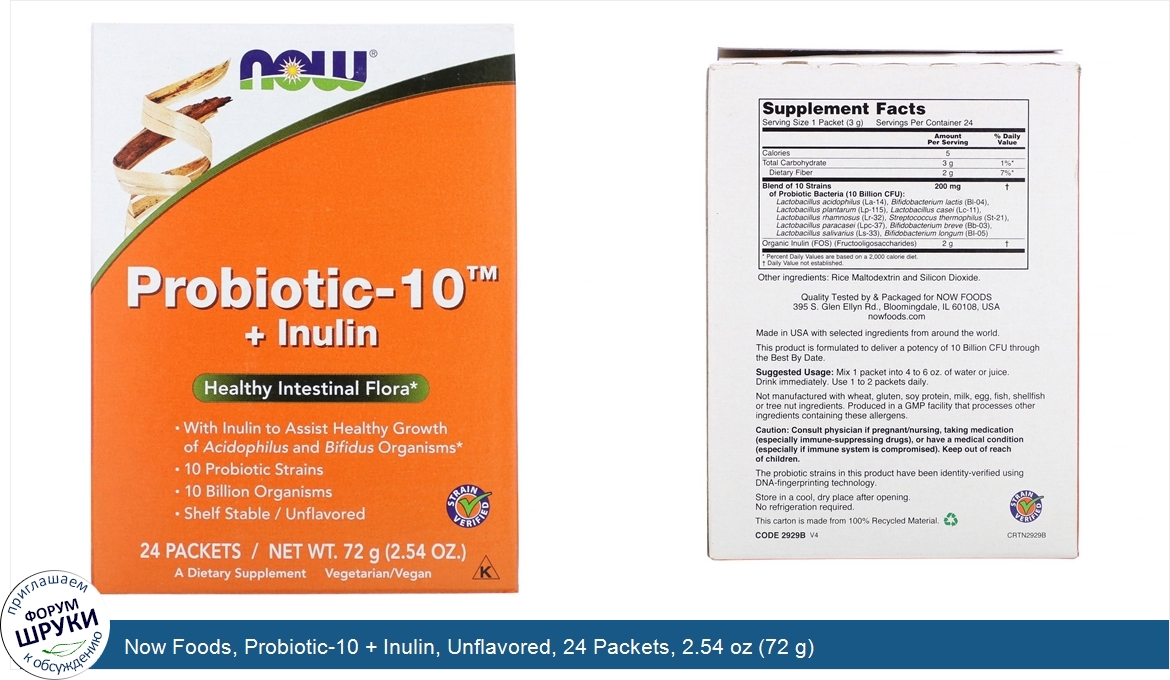 Друзья, если у вас есть отзыв/дополнение/комментарий/вопрос относительно Now Foods, Probiotic-10 + Inulin, Unflavored, 24 Packets, 2.54 oz (72 g) - напишите его ответом в эту тему (это будет полезно всему сообществу в целом и вам в отдельности).