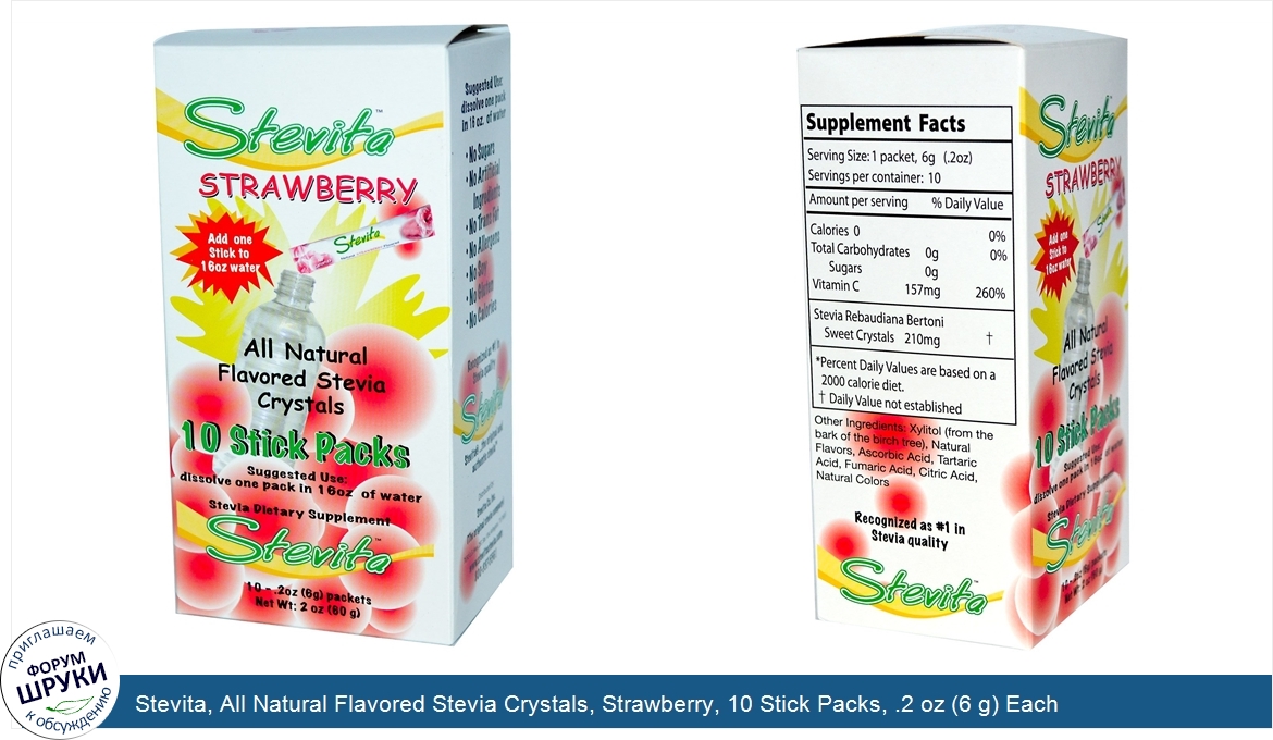 Друзья, если у вас есть отзыв/дополнение/комментарий/вопрос относительно Stevita, All Natural Flavored Stevia Crystals, Strawberry, 10 Stick Packs, .2 oz (6 g) Each - напишите его ответом в эту тему (это будет полезно всему сообществу в целом и вам в отдельности).