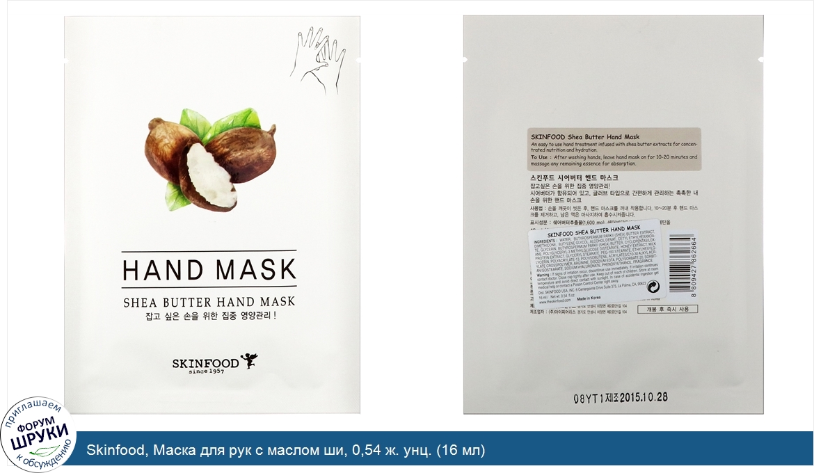 Друзья, если у вас есть отзыв/дополнение/комментарий/вопрос относительно Skinfood, Маска для рук с маслом ши, 0,54 ж. унц. (16 мл) - напишите его ответом в эту тему (это будет полезно всему сообществу в целом и вам в отдельности).