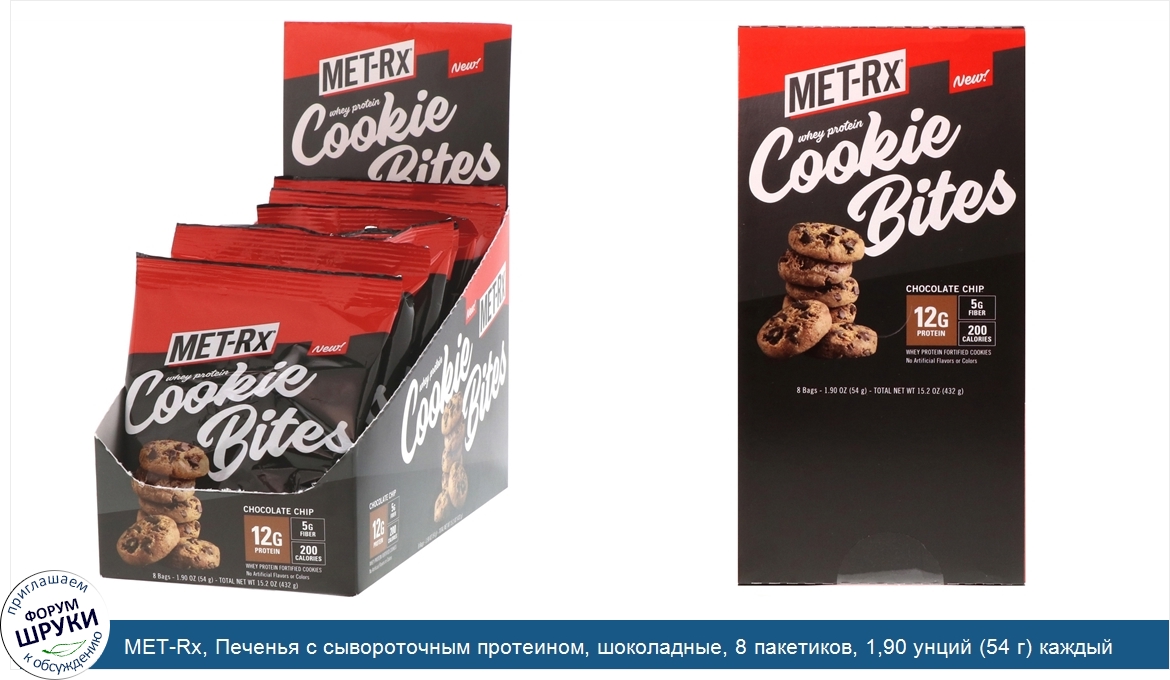 [DESCRIPT]12 g Protein. 5 g Fiber. 200 Calories. Why Protein Fortified Cookies. No Artificial Flavors or Colors. A bite-sized and delicious alternative to traditional cookies in the food market today. Met-Rx Cookie Bites are fortified with premium whey and milk proteins and are inspired by fresh baked cookies using real food ingredients like eggs, brown sugar, and chocolate chips. Our cookie bites deliver an authentic cookie experience in combination with providing a good source of protein and fiber-making them the perfect treat to snack on and fuel your training! Good Source of Protein. 50% More Protein than the Leading Protein Cookie Brand*. 20% Less Sugar than the Leading Protein Cookie Brand*. *Nielsen xAOC latest 52 weeks ending 2/24/18. Excluding online sales. Leading Protein Cookie Brand Chocolate Chip and Peanut Butter flavors have 8 g of protein and 12 g of sugar per 57 g servings.[/DESCRIPT]... (описание дополняется)