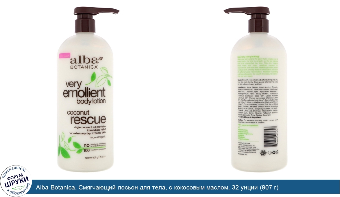 Друзья, если у вас есть отзыв/дополнение/комментарий/вопрос относительно Alba Botanica, Смягчающий лосьон для тела, с кокосовым маслом, 32 унции (907 г) - напишите его ответом в эту тему (это будет полезно всему сообществу в целом и вам в отдельности).