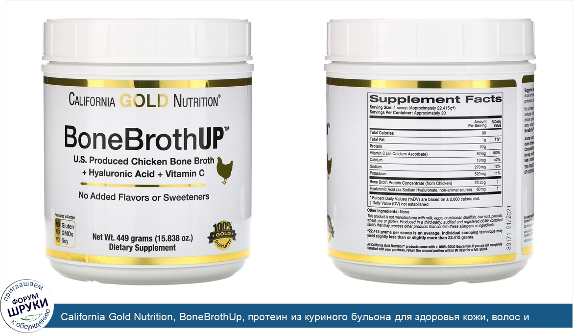 Друзья, если у вас есть отзыв/дополнение/комментарий/вопрос относительно California Gold Nutrition, BoneBrothUp, протеин из куриного бульона для здоровья кожи, волос и ногтей, с гиалуроновой кислотой и витаминомC, 449г (15,838унции) - напишите его ответом в эту тему (это будет полезно всему сообществу в целом и вам в отдельности).