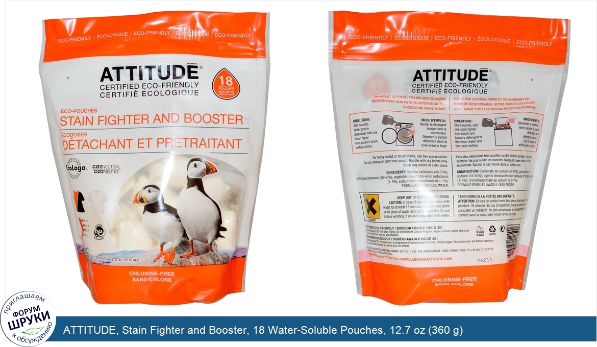 ATTITUDE, Stain Fighter and Booster, 18 Water-Soluble Pouches, 12.7 oz (360 g)