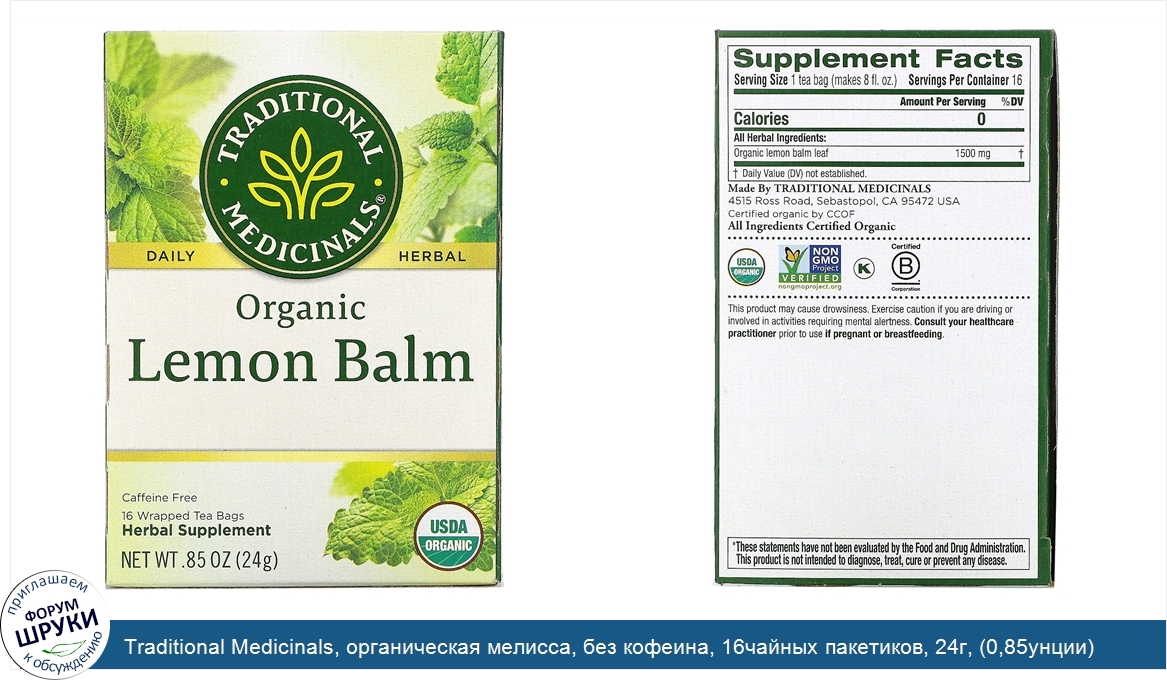 Друзья, если у вас есть отзыв/дополнение/комментарий/вопрос относительно Traditional Medicinals, органическая мелисса, без кофеина, 16чайных пакетиков, 24г, (0,85унции) - напишите его ответом в эту тему (это будет полезно всему сообществу в целом и вам в отдельности).