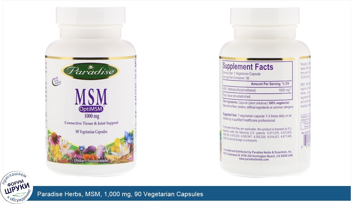 Друзья, если у вас есть отзыв/дополнение/комментарий/вопрос относительно Paradise Herbs, MSM, 1,000 mg, 90 Vegetarian Capsules - напишите его ответом в эту тему (это будет полезно всему сообществу в целом и вам в отдельности).