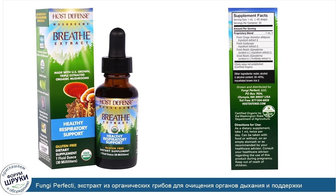 [DESCRIPT]Made with US Grown, Triple Extracted Organic Mushrooms. Gluten Free. Dietary Supplement. USDA Organic. Certified Organic by the Washington State Department of Agriculture. From the Forest, to our Farm, to You. Our liquid extracts provide rapid absorption and are great for those seeking immune support. Host Defense extracts may be used directly from the bottle, or in water, warm tea, coffee, juice or smoothies. Host Defense Breathe. Is a complementary blend of Chaga, Reishi and Cordyceps. Chaga is well known in Eastern Europe and Siberia for its support of skin and lung functioning. Reishi has long been used for centuries in China to support breathing, cardiovascular system and endurance. Cordyceps has long been celebrated in Tibet and Nepal as a lung tonic and energy support. Together, they strengthen respiratory function in normal, healthy individuals. Host Defense is the #1 Best-Selling Mushroom Brand in the US^. Identity Guaranteed – Guaranteed, Accurate Identity of Each Mushroom. USDA Organic – Certified Organic. US Grown and Processed. Produced Under the Direct Supervision of Paul Stamets, D.Sc. Bee Friendly. ^. Source: SPINSscan Natural / Natural Products Supermarkets >$2MM / Total US – Natural Channel / Mushrooms Ingredient Report / 52 Wks Ending 3/22/2015.[/DESCRIPT]... (описание дополняется)