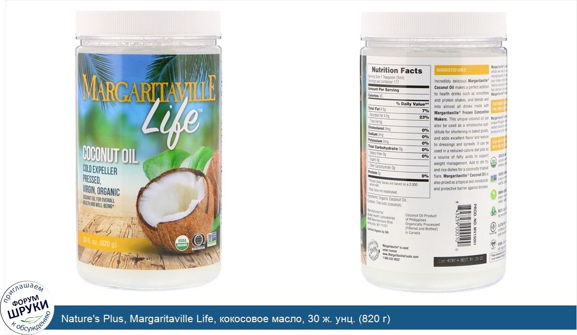Друзья, если у вас есть отзыв/дополнение/комментарий/вопрос относительно Nature's Plus, Margaritaville Life, кокосовое масло, 30 ж. унц. (820 г) - напишите его ответом в эту тему (это будет полезно всему сообществу в целом и вам в отдельности).