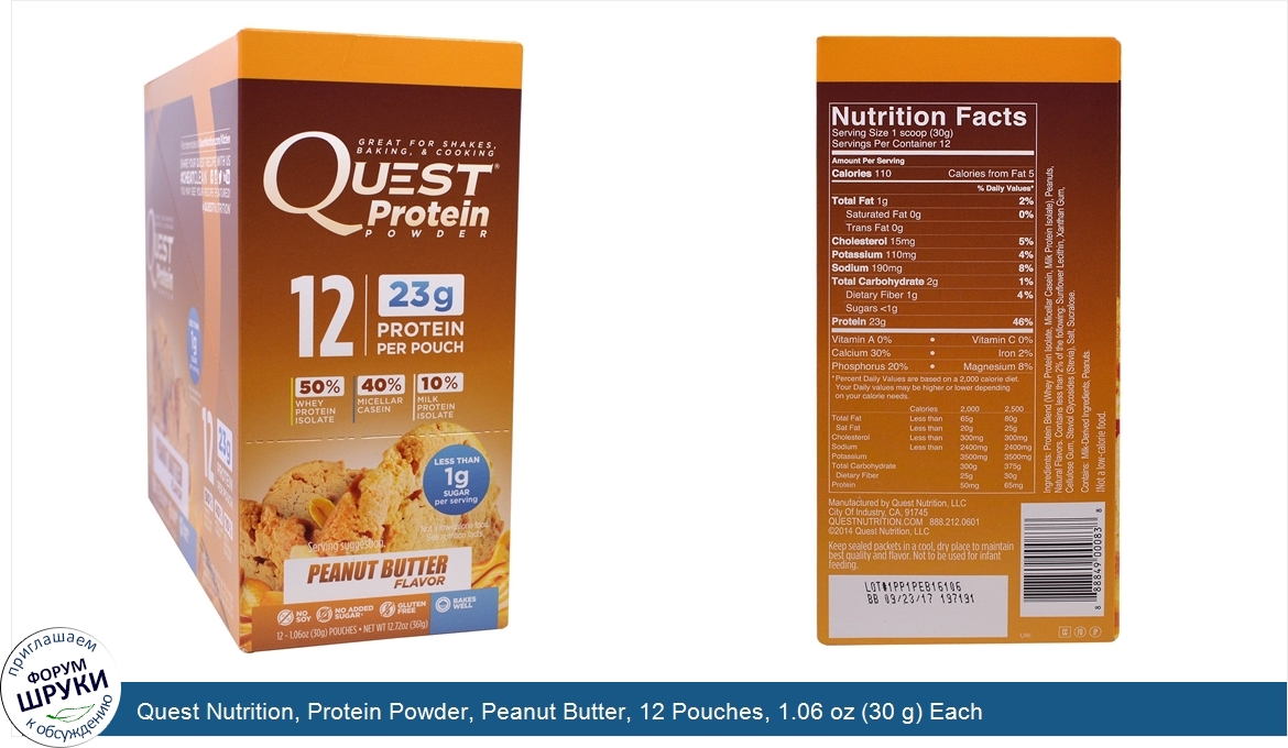 Друзья, если у вас есть отзыв/дополнение/комментарий/вопрос относительно Quest Nutrition, Protein Powder, Peanut Butter, 12 Pouches, 1.06 oz (30 g) Each - напишите его ответом в эту тему (это будет полезно всему сообществу в целом и вам в отдельности).