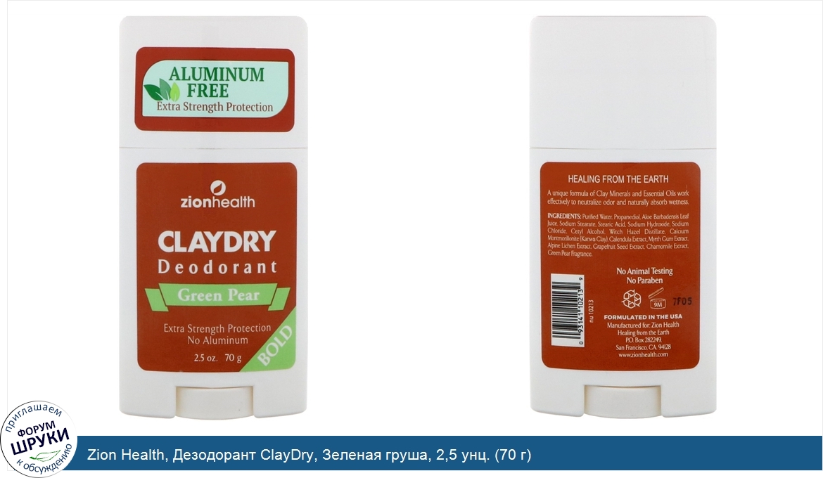 Zion Health, Дезодорант ClayDry, Зеленая груша, 2,5 унц. (70 г)