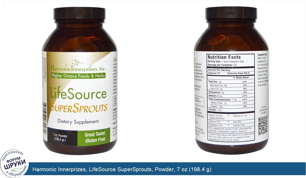 Друзья, если у вас есть отзыв/дополнение/комментарий/вопрос относительно Harmonic Innerprizes, LifeSource SuperSprouts, Powder, 7 oz (198.4 g) - напишите его ответом в эту тему (это будет полезно всему сообществу в целом и вам в отдельности).
