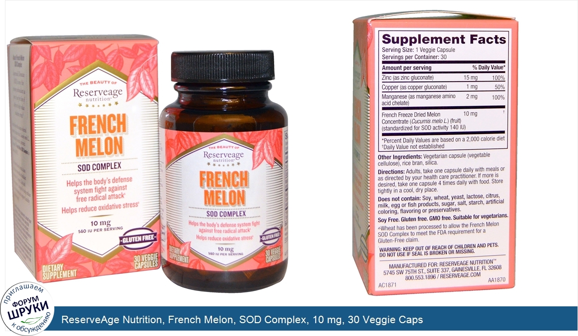 [DESCRIPT]Helps the Body's Defense System Fight Against Free Radical Attack. Helps Reduce Oxidative Stress. 140 IU Per Serving. Gluten Free^. Dietary Supplement. The Power of Science in Nature. Harnessing the authentic and revitalizing nature from the South of France, Reserveage Nutrition unveils the latest technology in support of healthy cellular aging from a rare variety of melon grown exclusively in the Luberon region of Provence. The Benefits of SOD. Our French Melon SOD Complex helps the body's defense system fight free radicals and promotes reduced oxidative stress, helping you maintain good health. Patented Source. Our concentrated patented source is the first and only stabilized form of SOD that is freeze-dried and specially encapsulated to ensure optimal bioactivity. About French Melon SOD Complex. Superoxide Dismutase (SOD) is one of the primary antioxidants as part of our first line of defense to help reduce oxidative stress. Derived from the unique selected variety of melon fruit, Cucumis melo L., our naturally sourced, patented Extramel French Melon SOD Complex is dense in SOD. This powerhouse formula also combines essential antioxidant nutrients - Copper, Zinc and Manganese - designed to help reduce oxidative stress and support healthy cellular aging. ^Wheat has been processed to allow the French Melon SOD Complex to meet the FDA requirement for a Gluten-Free claim.[/DESCRIPT]... (описание дополняется)