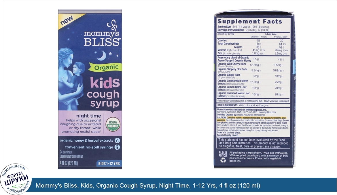 [DESCRIPT]USDA Organic. Organic Honey and Herbal Extracts. Convenient No-Spill Syringe. 24 Servings. Liquid Dietary Supplement. Kids 1-12 Yrs. Certified Organic by: Quality Assurance International. Contents Certified NSF®. Non GMO. Helps with occasional coughing due to irritated or dry throat while promoting restful sleep. Organic kids cough syrup night time is an herbal supplement carefully crafted for kids to soothe dry throat and calm occasional coughing while promoting restful sleep. Organic Honey. Organic Slippery Elm Bark. Organic Wild Cherry Bark. Chamomile Lemon Balm Extracts. for moms, by moms. Our family run company was founded by my mom, who raised three children while working as a nurse certified midwife. Driven by compassion for other moms, she created Mommy's Bliss to safely and naturally bring families back to wellness. As a new mom myself, I understand how important it is to choose products that I trust to work effectively, safely and make my little ones happy! -Yasmin Kaderali, mom, daughter CEO[/DESCRIPT]... (описание дополняется)