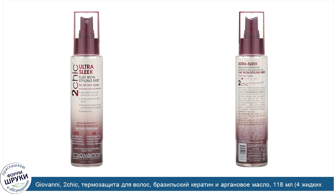 Giovanni, 2chic, термозащита для волос, бразильский кератин и аргановое масло, 118 мл (4 жидких унции)