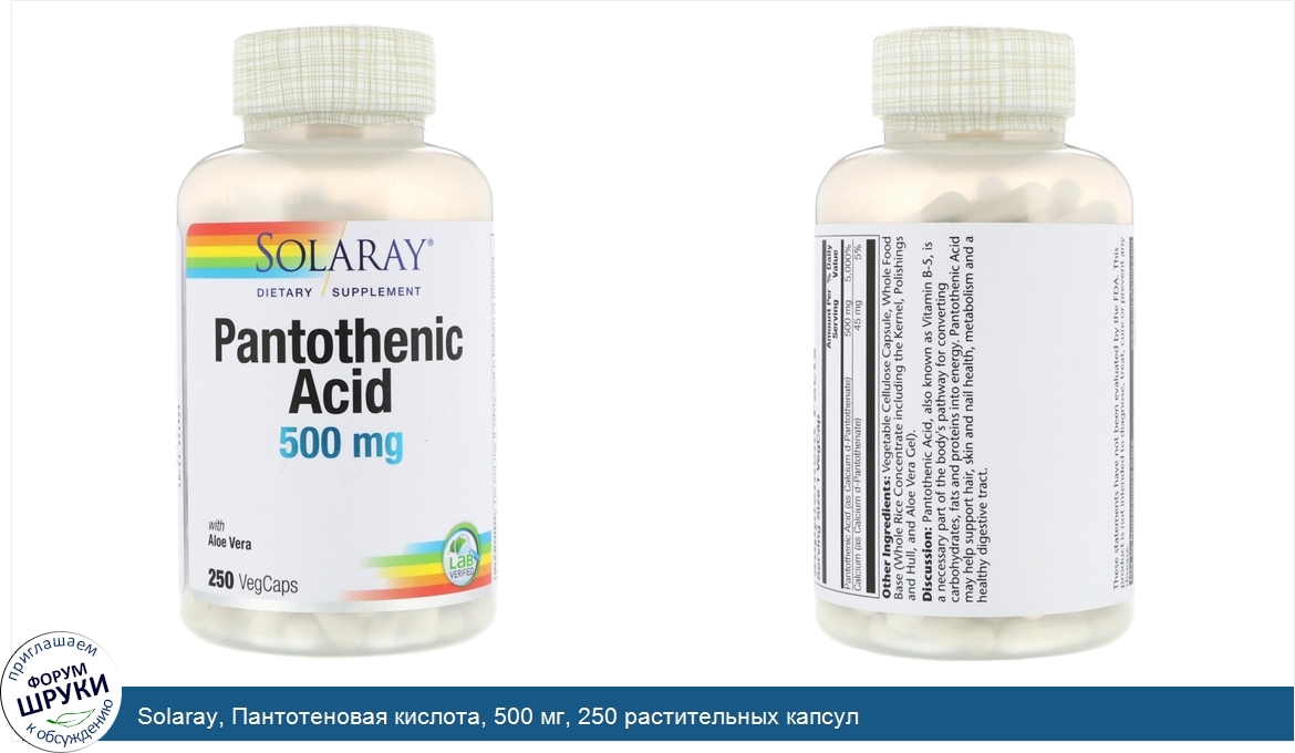 Друзья, если у вас есть отзыв/дополнение/комментарий/вопрос относительно Solaray, Пантотеновая кислота, 500 мг, 250 растительных капсул - напишите его ответом в эту тему (это будет полезно всему сообществу в целом и вам в отдельности).