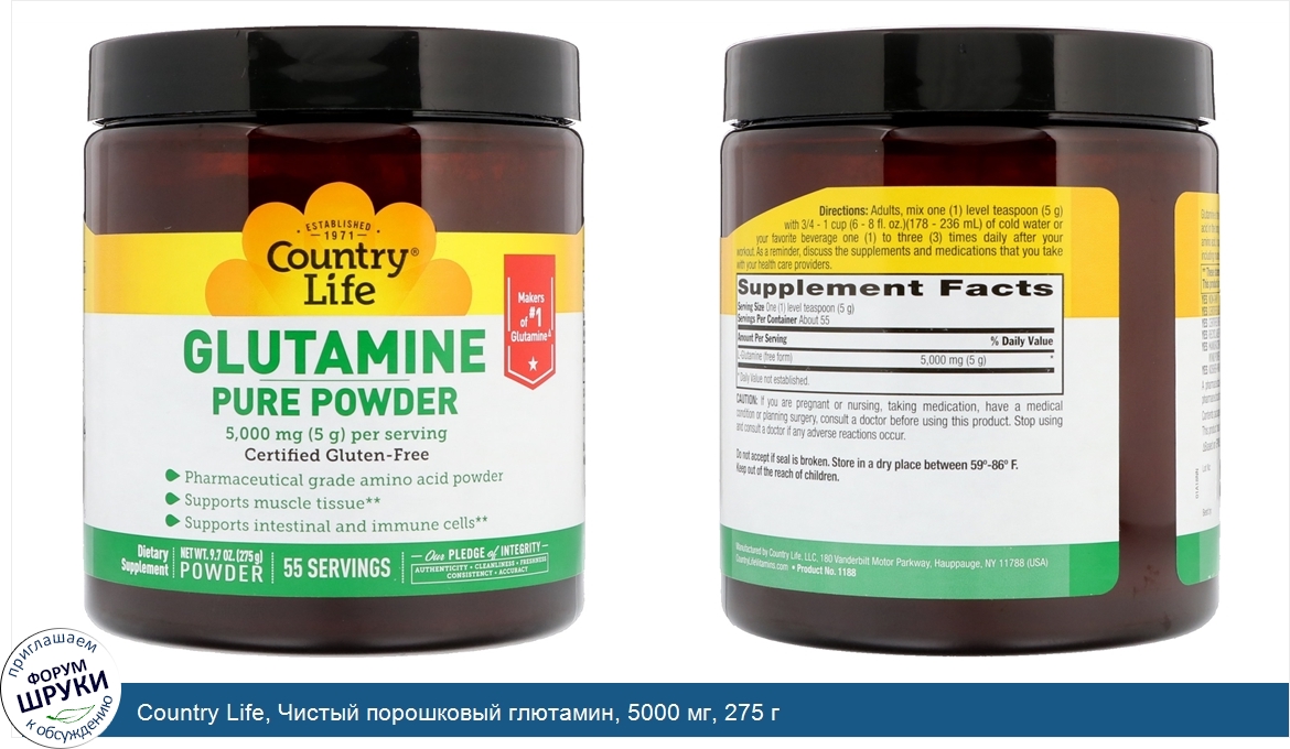 Друзья, если у вас есть отзыв/дополнение/комментарий/вопрос относительно Country Life, Чистый порошковый глютамин, 5000 мг, 275 г - напишите его ответом в эту тему (это будет полезно всему сообществу в целом и вам в отдельности).