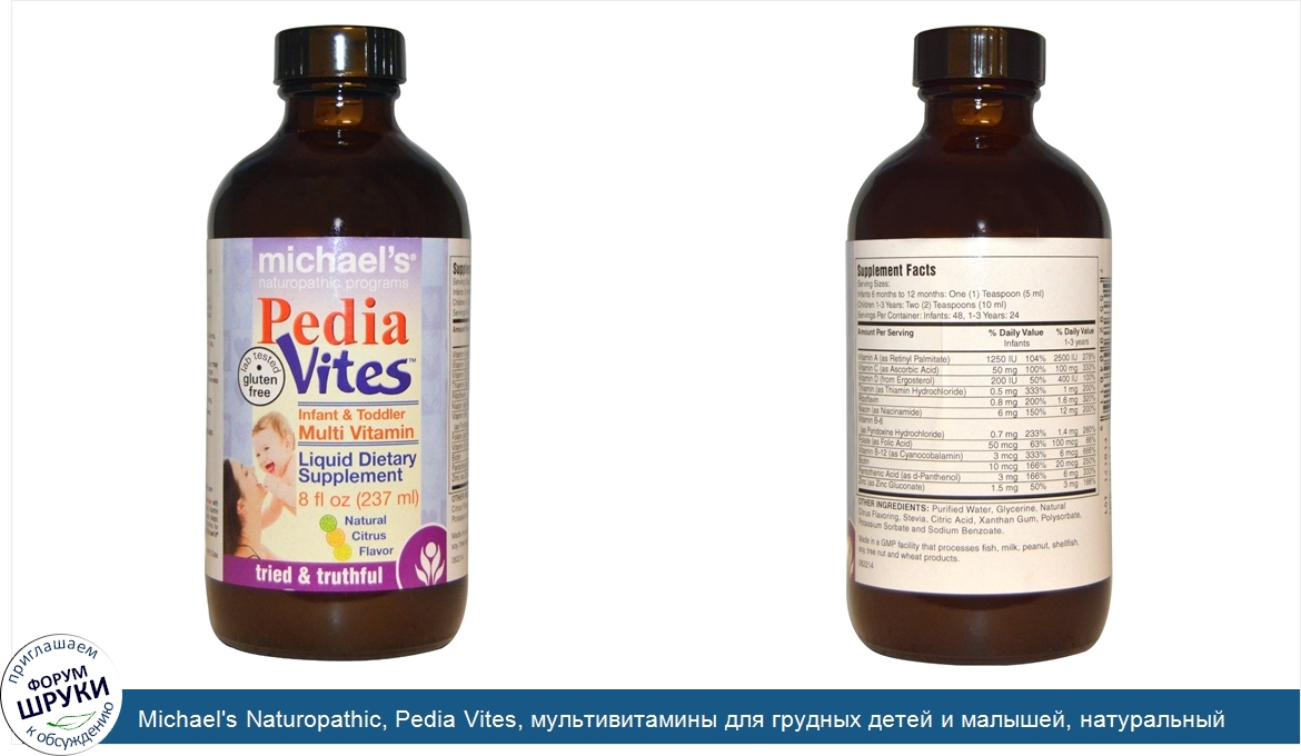 Друзья, если у вас есть отзыв/дополнение/комментарий/вопрос относительно Michael's Naturopathic, Pedia Vites, мультивитамины для грудных детей и малышей, натуральный цитрусовый вкус, 8 жидких унций (237 мл) - напишите его ответом в эту тему (это будет полезно всему сообществу в целом и вам в отдельности).