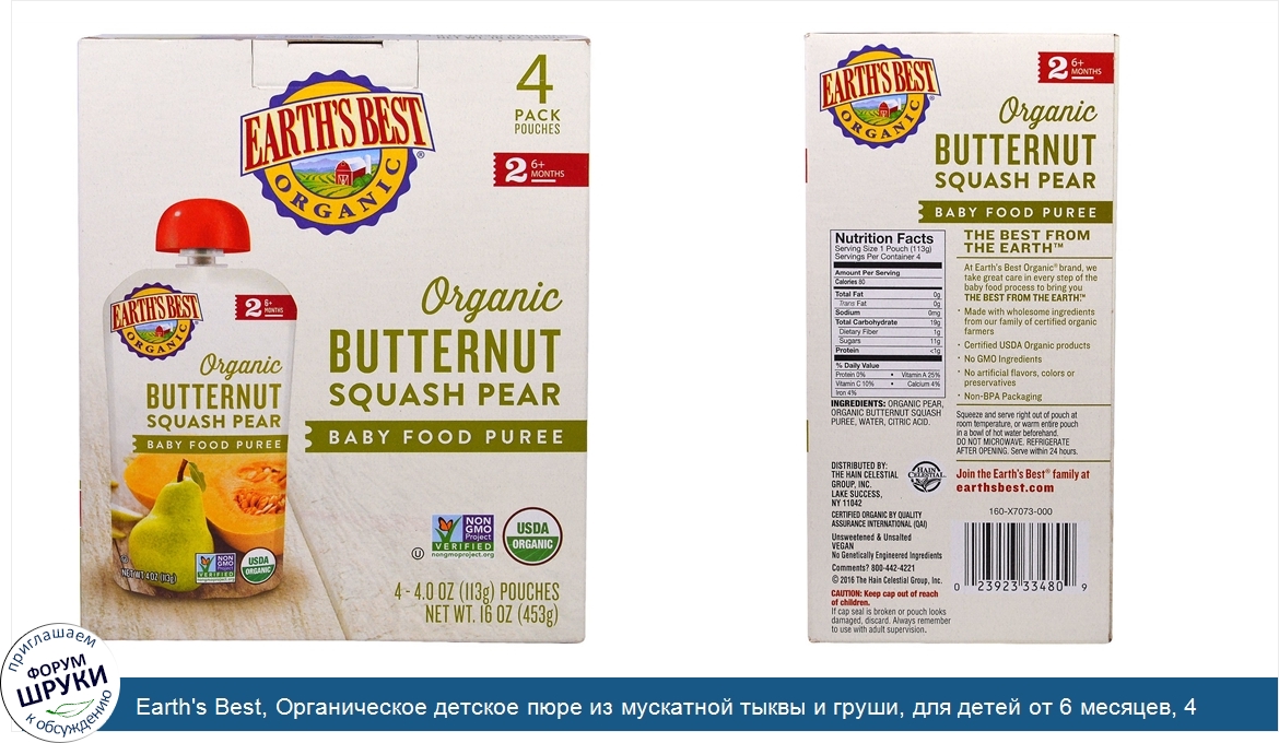 Друзья, если у вас есть отзыв/дополнение/комментарий/вопрос относительно Earth's Best, Органическое детское пюре из мускатной тыквы и груши, для детей от 6 месяцев, 4 пакета по 4,0 унции (113 г) - напишите его ответом в эту тему (это будет полезно всему сообществу в целом и вам в отдельности).