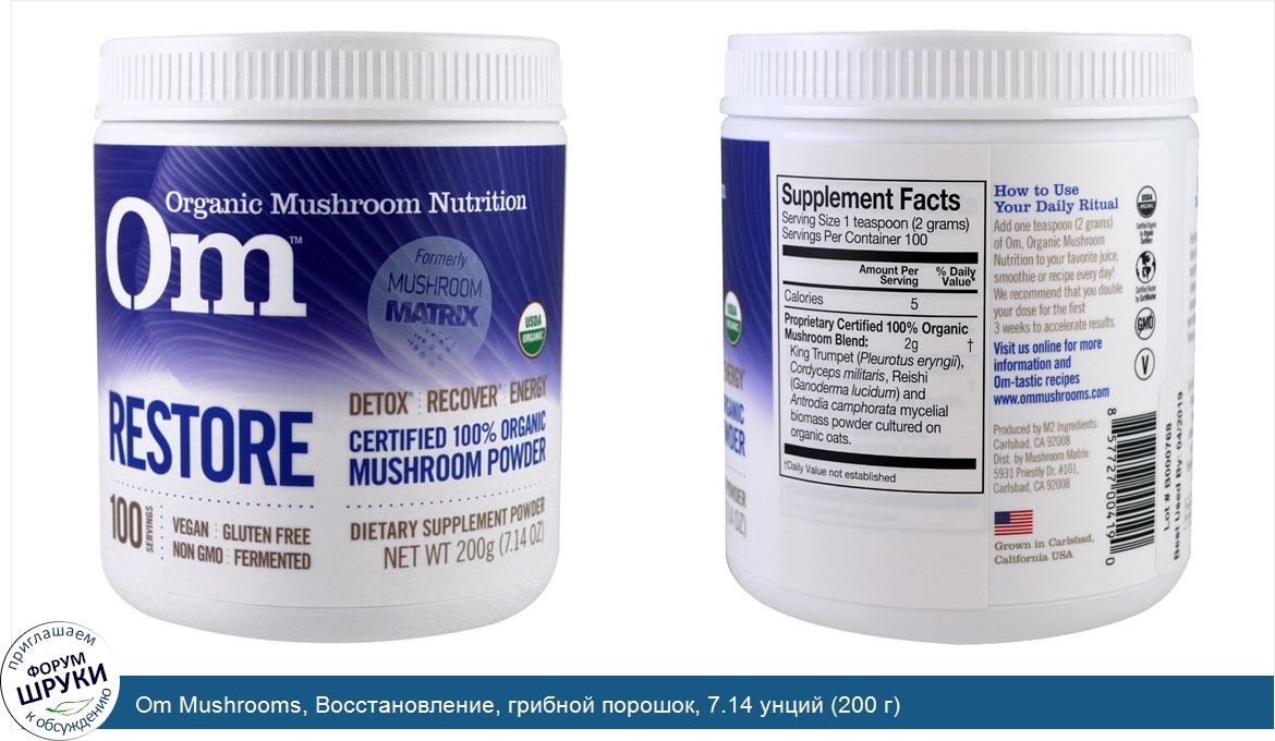 [DESCRIPT]Formerly Mushroom Matrix. USDA Organic. Detox - Recover - Energy. Certified 100% Organic Mushroom Powder. 100 Servings. Vegan. Gluten Free. Non GMO. Fermented. Dietary Supplement Powder. Certified Organic by Organic Certifiers. Restore Detox. Recover. Energy. Feel the restorative power of our dynamic blend of organic mushrooms to fuel your body through recovery. Supports positive inflammation response, detox, immune support and energy replenishment. Give your body the nourishment it needs to keep thriving after strenuous workouts when in need of a refresh. Our Full Spectrum Organic Mushrooms Naturally Contain: beta glucans, prebiotics, digestive enzymes, antioxidants, amino acids, proteins, peptides, lectins, polyphenols, flavonoids, selenium compounds and other myconutrients. Discover the Wisdom of Om. Om is a leading producer of pure, fresh, Certified 100% Organic Medicinal Mushroom Powders. Our team traveled the world to discover our unique mushroom varieties that combines the perfect balance of ancient wisdom with our modern growing methodology. We encourage you to try for yourself and experience a new level of vibrancy and overall wellness.[/DESCRIPT]... (описание дополняется)