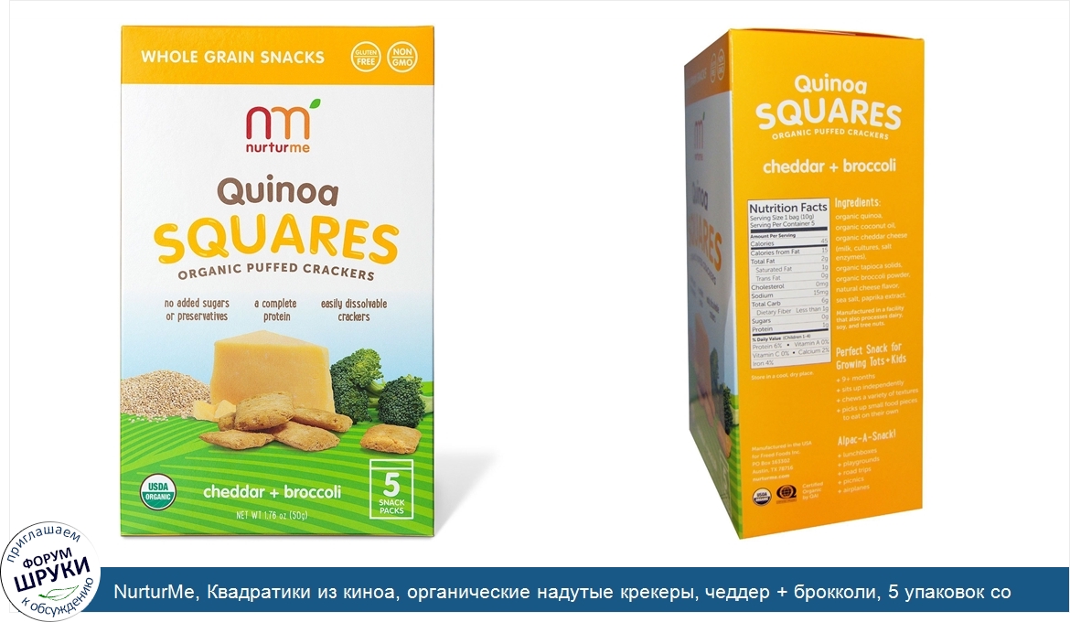 NurturMe, Квадратики из киноа, органические надутые крекеры, чеддер + брокколи, 5 упаковок со снеками, 10 г каждая