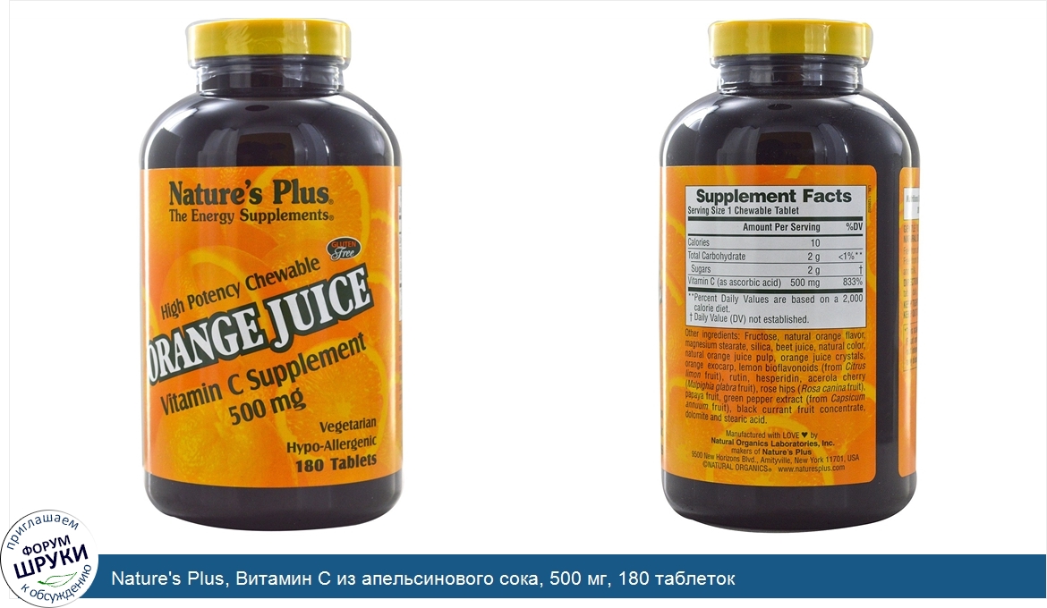 Друзья, если у вас есть отзыв/дополнение/комментарий/вопрос относительно Nature's Plus, Витамин С из апельсинового сока, 500 мг, 180 таблеток - напишите его ответом в эту тему (это будет полезно всему сообществу в целом и вам в отдельности).