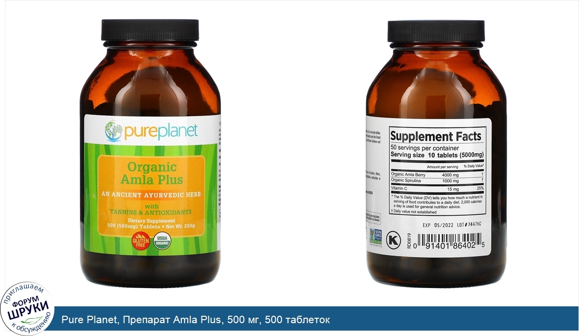 [DESCRIPT]Без ГМО | Органический продукт | Не содержит глютена. Органический продукт по классификации USDA. Древняя аюрведическая трава. Пищевая добавка. Танины. Антиоксиданты. Препарат Amla Plus сертифицирован компанией QAI как 100% органический продукт. Кошерный продукт. Амла является самой почитаемой травой в древней аюрведической медицине. Это натуральный терпкий на вкус, здоровый источник чистого витамина С и танинов. Pure Planet включает в запатентованную смесь, обеспечивающую баланс питательных веществ и высокую эффективность действия, только отборные плоды амалаки.[/DESCRIPT]... (описание дополняется)