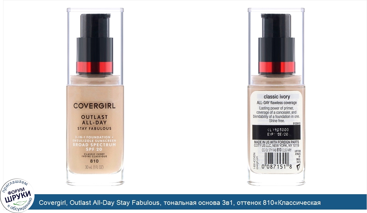 Covergirl, Outlast All-Day Stay Fabulous, тональная основа 3в1, оттенок 810«Классическая слоновая кость», 30мл (1 жидк.унция)