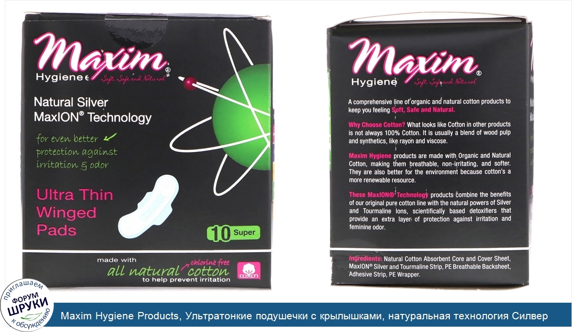 [DESCRIPT]Soft, Safe and Natural. For Even Better Protection Against Irritation Odor. Made with All Natural Chlorine Free Cotton to Help Prevent Irritation. Unique Designs for More Comfort and Better Protection. MaxION Silver Tourmaline Strip. 100% Natural Cotton Absorbent Core. Breathable Leak Protection Back Layer. Adhesive Strip. 100% Natural Cotton Cover Sheet. Leakage Control Channels. Winged. Individually Wrapped. A comprehensive line of organic and natural cotton products to keep you feeling soft, safe and natural. Why Choose Cotton? What looks like Cotton in other products is not always 100% Cotton. It is usually a blend of wood pulp and synthetics, like rayon and viscose. Maxim Hygiene products are made with Organic and Natural Cotton, making them breathable, non-irritating, and softer. They are also better for the environment because cotton's a more renewable resource. These MaxION Technology products combine the benefits of our original pure cotton line with the natural powers of Silver and Tourmaline Ions, scientifically based detoxifiers that provide an extra layer of protection against irritation and feminine odor.[/DESCRIPT]... (описание дополняется)