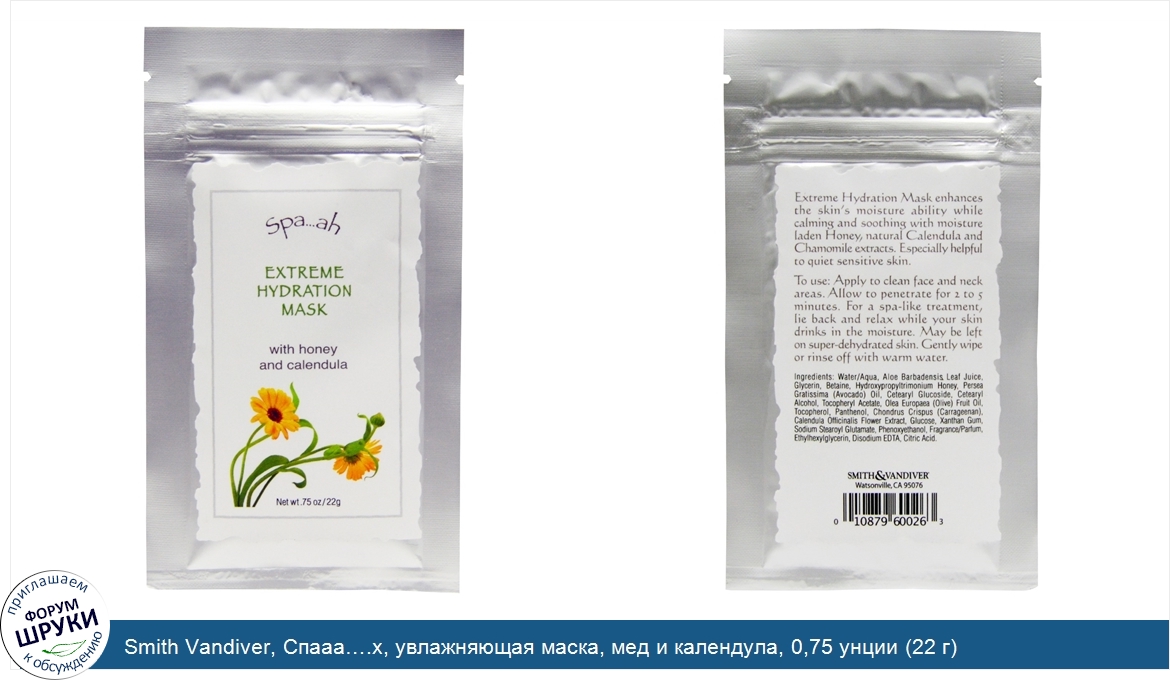 Smith Vandiver, Спааа….х, увлажняющая маска, мед и календула, 0,75 унции (22 г)