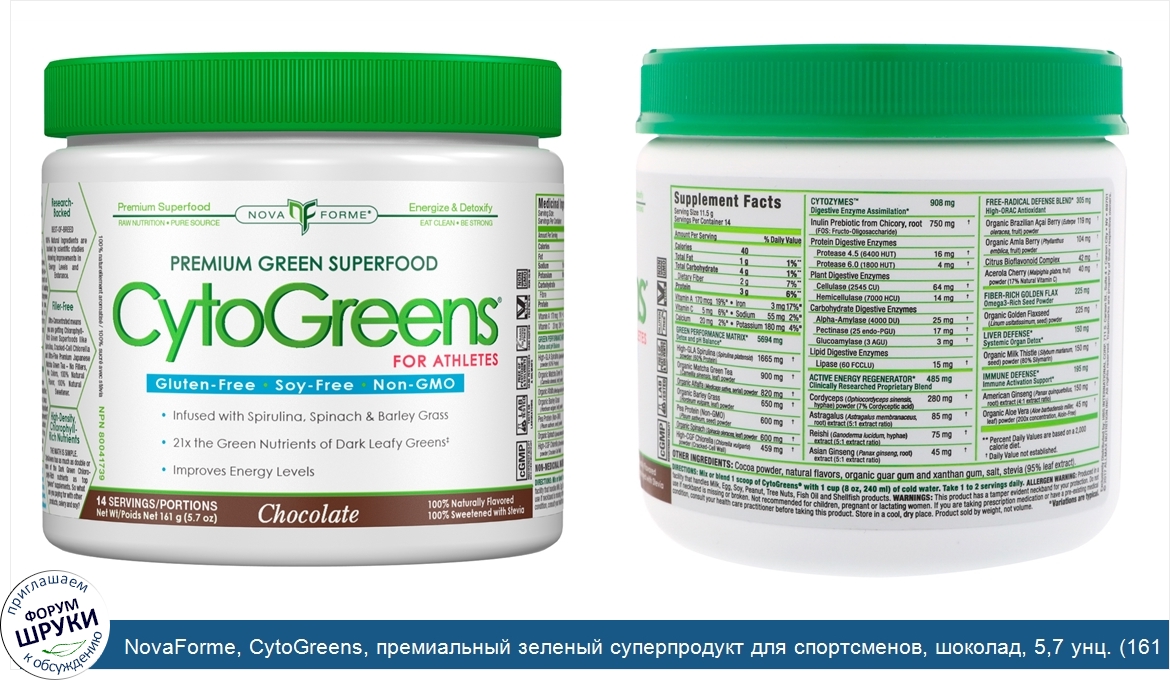 Друзья, если у вас есть отзыв/дополнение/комментарий/вопрос относительно NovaForme, CytoGreens, премиальный зеленый суперпродукт для спортсменов, шоколад, 5,7 унц. (161 г) - напишите его ответом в эту тему (это будет полезно всему сообществу в целом и вам в отдельности).
