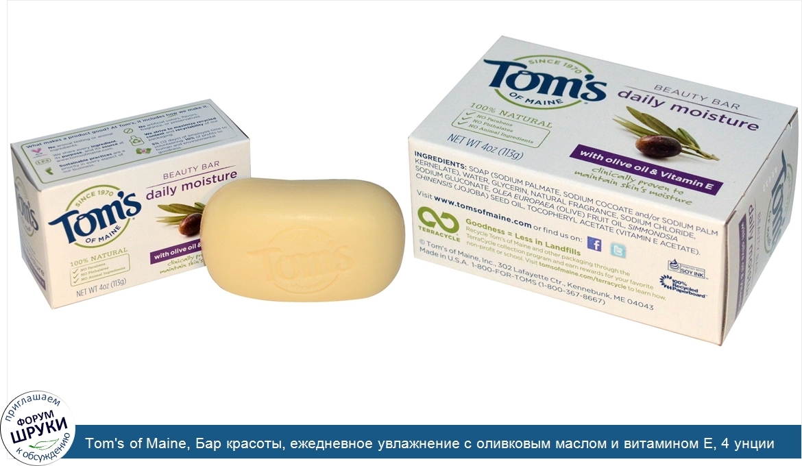 Tom's of Maine, Бар красоты, ежедневное увлажнение с оливковым маслом и витамином Е, 4 унции (113 г)