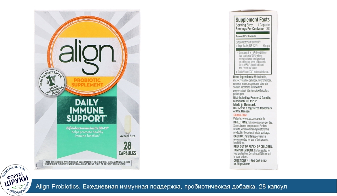 From the Makers of the #1 Doctor Recommended Brand. ‡. Probiotic Supplement. Bifidobacterium Lactis BB-12 Helps Promote Healthy Immune Function. Gluten-Free. 2 Blister Packs Inside. Align Daily Immune Support con...