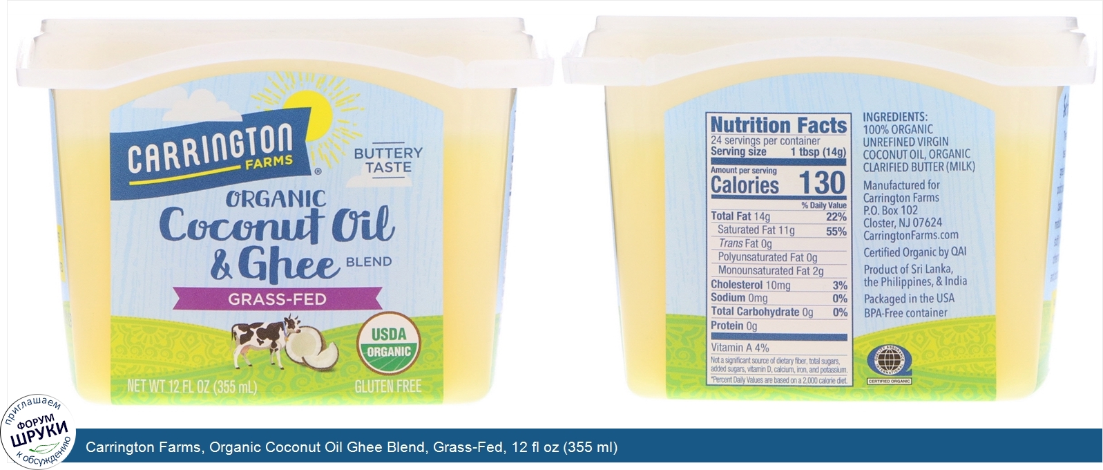 Друзья, если у вас есть отзыв/дополнение/комментарий/вопрос относительно Carrington Farms, Organic Coconut Oil Ghee Blend, Grass-Fed, 12 fl oz (355 ml) - напишите его ответом в эту тему (это будет полезно всему сообществу в целом и вам в отдельности).