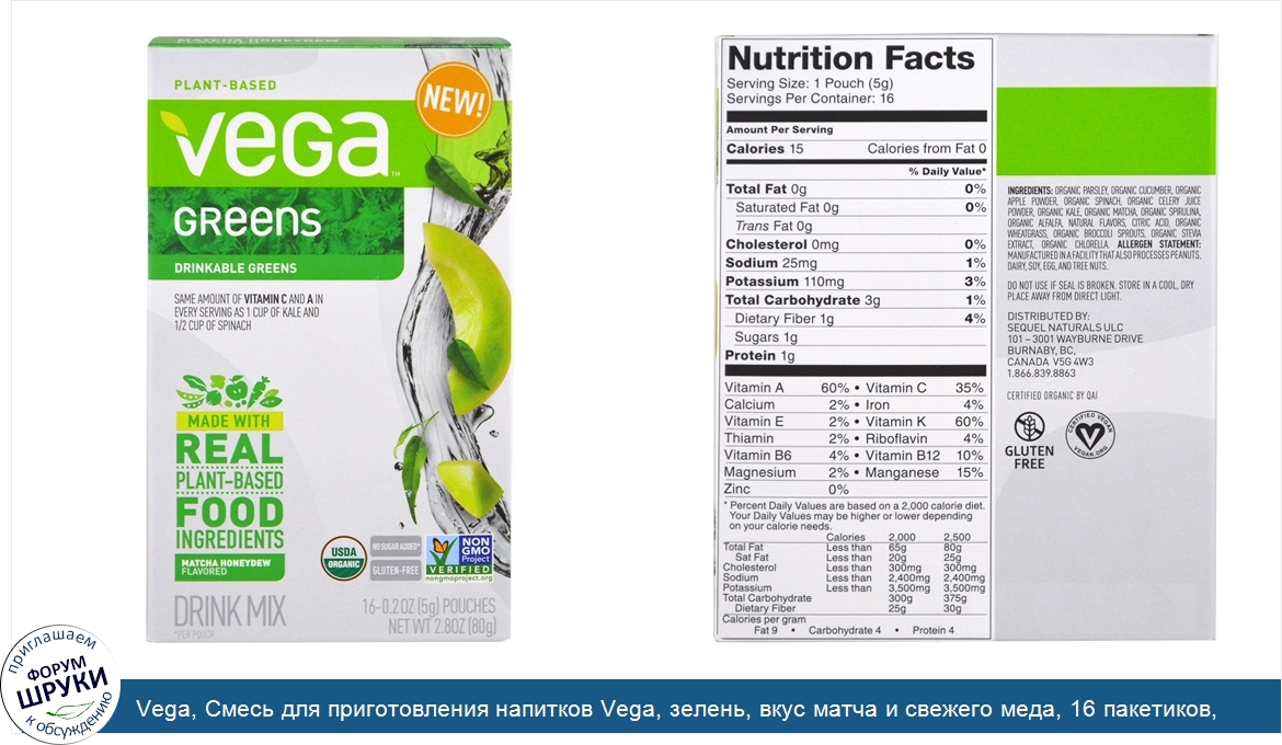 [DESCRIPT]Plant-Based. Gluten-Free. Drinkable Greens. Same Amount of Vitamin C and A in Every Serving as 1 Cup of Kale and 1/2 Cup of Spinach. Made with Real Plant-Based Food Ingredients. USDA Organic. No Sugar Added*. Non-GMO Project Verified. Certified Vegan. Certified Organic by QAI. *Per Pouch. A World of Premium Plant-Based Nutrition. No matter what better means to you, Vega shares the knowledge, nutrition and inspiration to support your quest to thrive, one small change at a time. Like Vega Greens? . Vega Vitamins or Vega Probiotics can help you support your daily nutrition, one refreshing drink at a time. Getting your greens has never been easier. Get nutritional support that works with your busy life with help from Vega Greens. Made from real, plant-based food ingredients, Vega Greens helps you fit in the nutrition you want, wherever you are.[/DESCRIPT]... (описание дополняется)