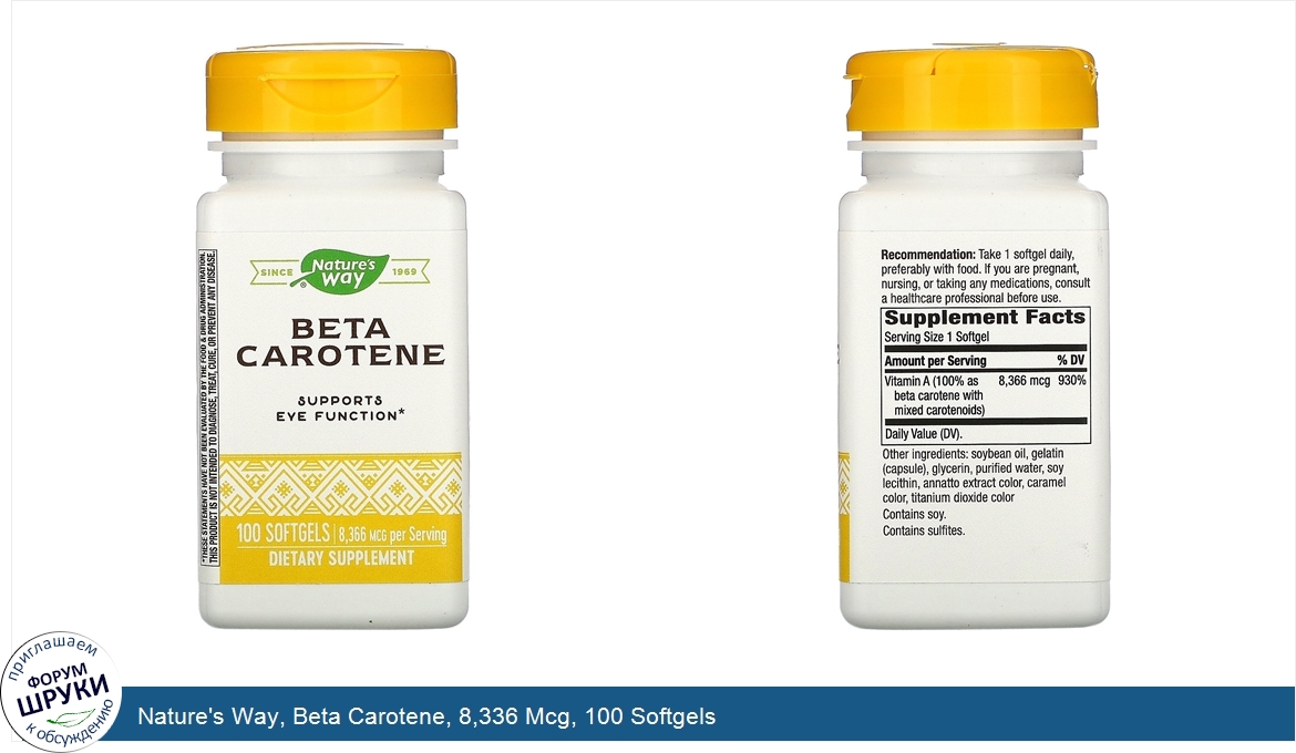 Друзья, если у вас есть отзыв/дополнение/комментарий/вопрос относительно Nature's Way, Beta Carotene, 8,336 Mcg, 100 Softgels - напишите его ответом в эту тему (это будет полезно всему сообществу в целом и вам в отдельности).