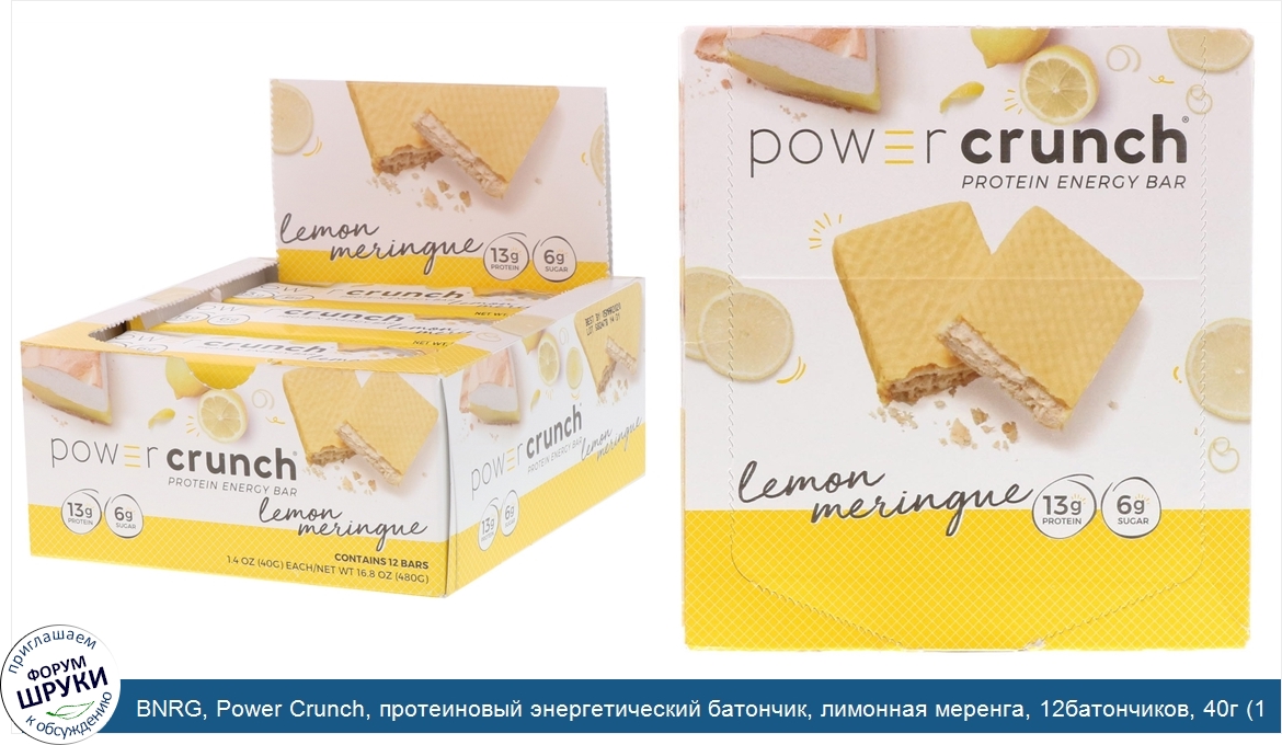 ru BNRG, Power Crunch, протеиновый энергетический батончик, лимонная меренга, 12батончиков, 40г (1,4унции) каждый