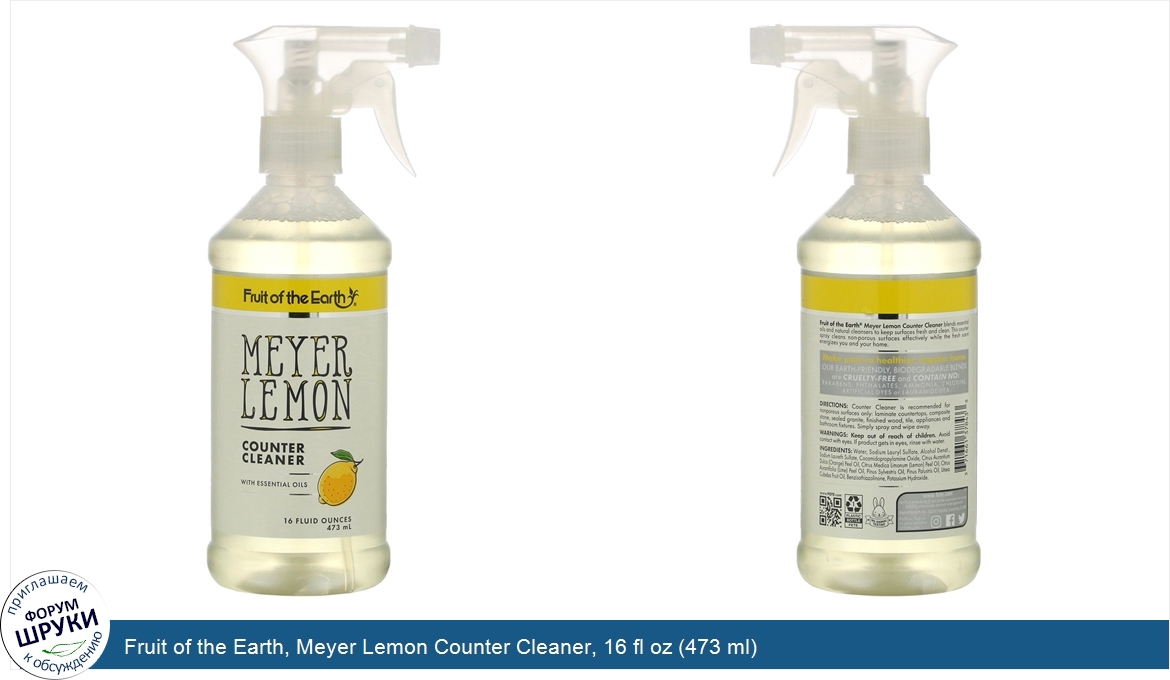 [DESCRIPT]With Essential Oils. No Animal Testing. Fruit of the Earth® Meyer Lemon Counter Cleaner blends essential oils and natural cleansers to keep surfaces fresh and clean. This counter spray cleans non-porous surfaces effectively while the fresh scent energizes you and your home. Make yours a healthier, happier home. Our Earth-friendly, biodegradable blends are cruelty-free and contain no: parabens, phthalates, ammonia, chlorine, artificial dyes or lauramide DEA.[/DESCRIPT]... (описание дополняется)