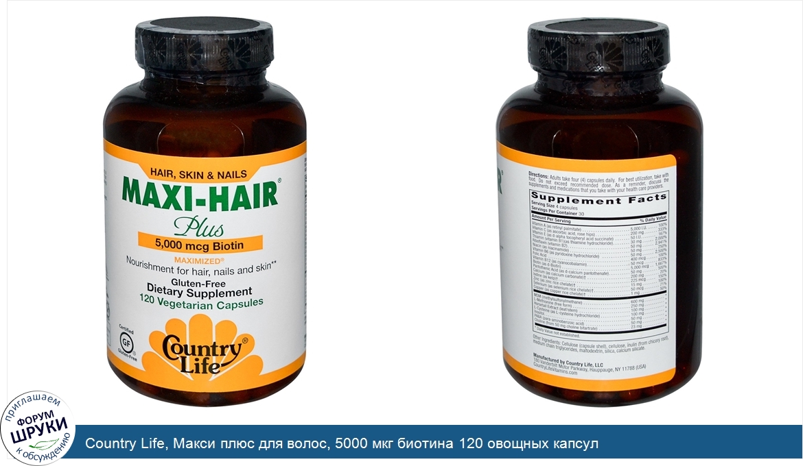 Друзья, если у вас есть отзыв/дополнение/комментарий/вопрос относительно Country Life, Макси плюс для волос, 5000 мкг биотина 120 овощных капсул - напишите его ответом в эту тему (это будет полезно всему сообществу в целом и вам в отдельности).