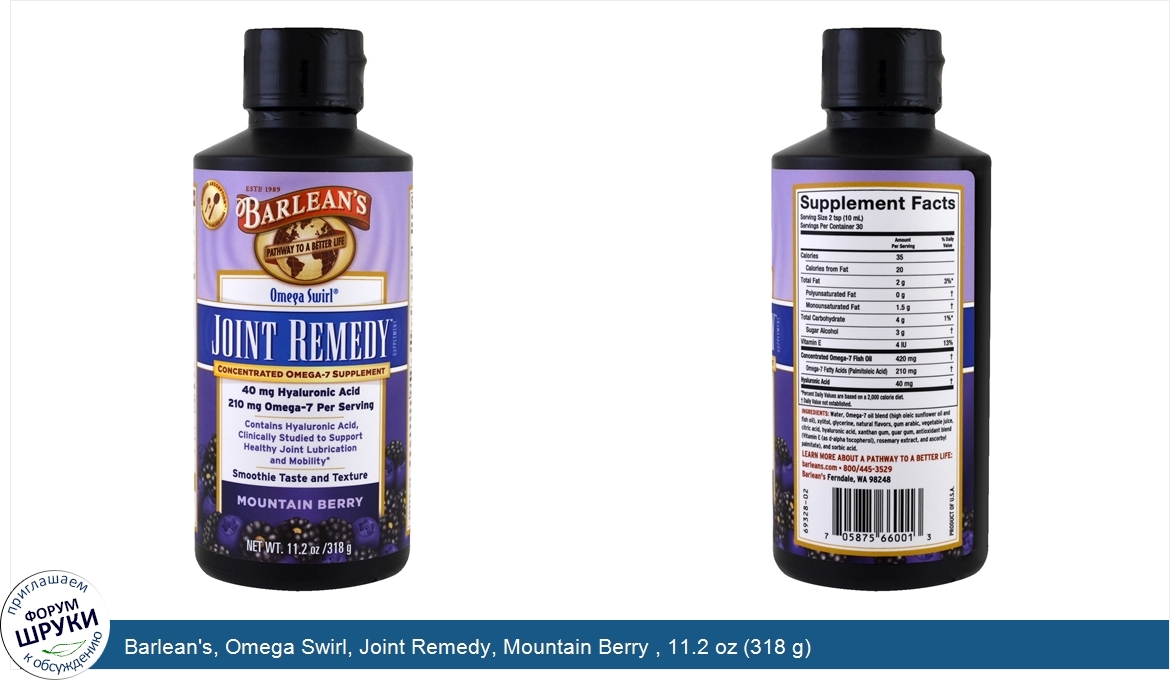 [DESCRIPT]ESTD 1989. Pathway to a Better Life. Concentrated Omega-7 Supplement. 40 mg Hyaluronic Acid. 210 mg Omega-7 per Serving. Contains Hyaluronic Acid, Clinically Studied to Support Healthy Joint Lubrication and Mobility. Smoothie Taste and Texture. Amplified Absorption = Designed to Deliver More. From Our Family To Yours. Barlean's Joint Remedy is a Nutrition Revolution. Cutting edge nutrition and great taste finally collide! Barlean's Joint Remedy Swirl combines 210 mg pharmaceutical grade Omega-7 and 40 mg Hyaluronic Acid in a breakthrough joint health formula with the taste and texture of a fruit smoothie. Delicious Mountain Berry Smoothie Taste Texture. Made with 420 mg of Highly Purified Premium Fish Oil. Concetrated 210 mg Omega-7 and 40 mg Hyaluronic Acid Per Serving. Emulsified for Superior Nutrient Absorption. No Artificial Flavors or Colors. No sugar: naturally sweetened with xylitol. Gluten free, Non-GMO. ‡Amplified absorption - Barlean's proprietary emulsification technology is designed to boost absorption and deliver significantly more nutritional value than standard supplements.[/DESCRIPT]... (описание дополняется)