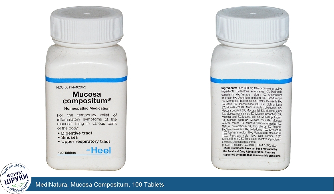 Друзья, если у вас есть отзыв/дополнение/комментарий/вопрос относительно MediNatura, Mucosa Compositum, 100 Tablets - напишите его ответом в эту тему (это будет полезно всему сообществу в целом и вам в отдельности).