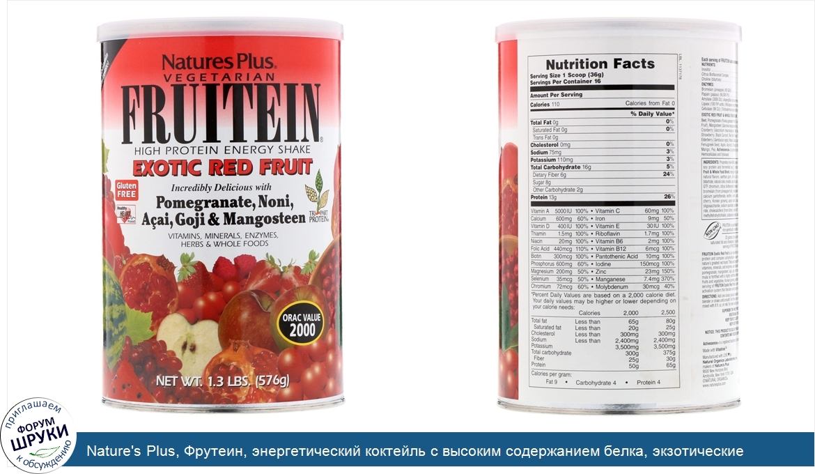 ru Nature's Plus, Фрутеин, энергетический коктейль с высоким содержанием белка, экзотические красные фрукты, 1,3 фунта (576 г)