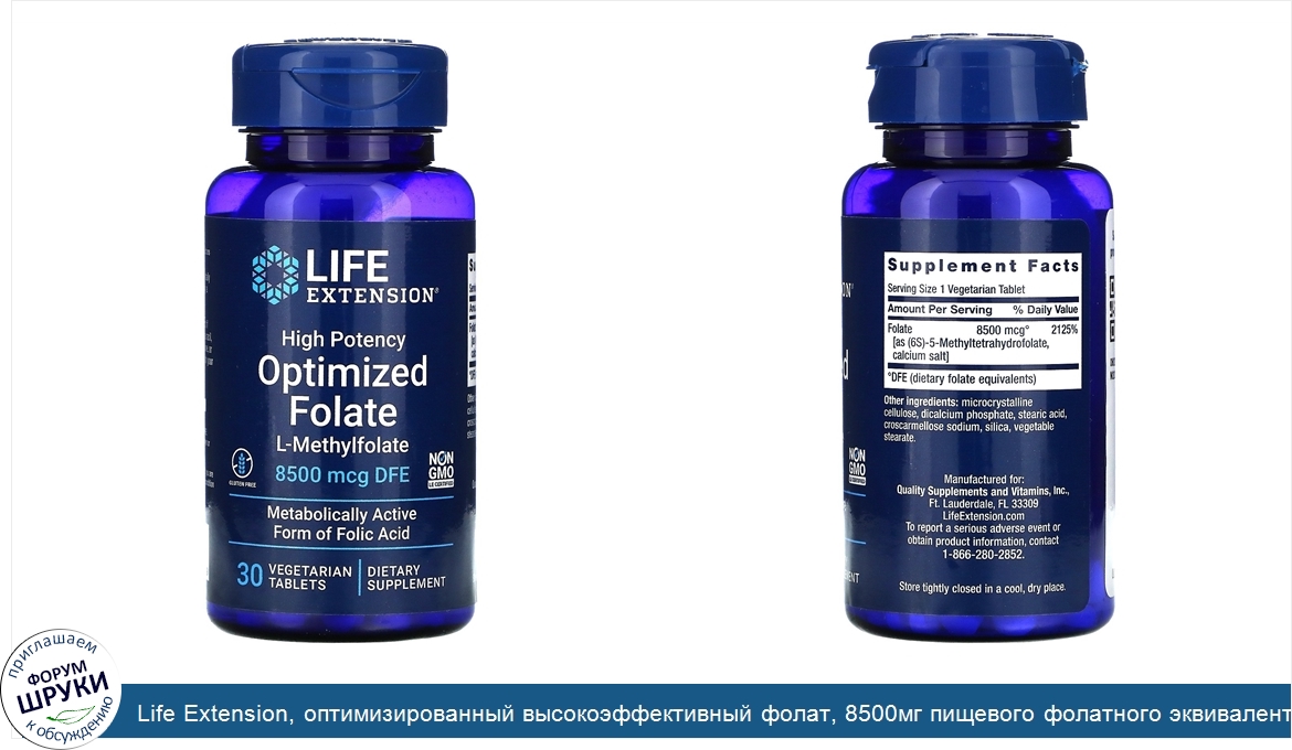 Life Extension, оптимизированный высокоэффективный фолат, 8500мг пищевого фолатного эквивалента, 30вегетарианских таблеток