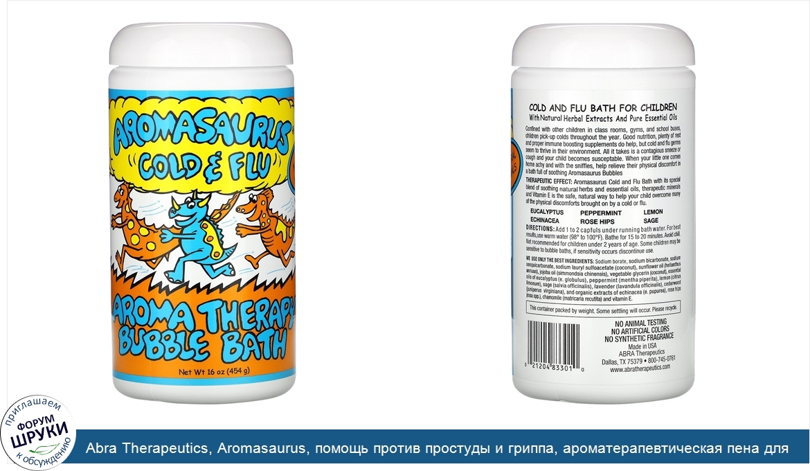 Друзья, если у вас есть отзыв/дополнение/комментарий/вопрос относительно Abra Therapeutics, Aromasaurus, помощь против простуды и гриппа, ароматерапевтическая пена для ванны, 453 г (16 унций) - напишите его ответом в эту тему (это будет полезно всему сообществу в целом и вам в отдельности).