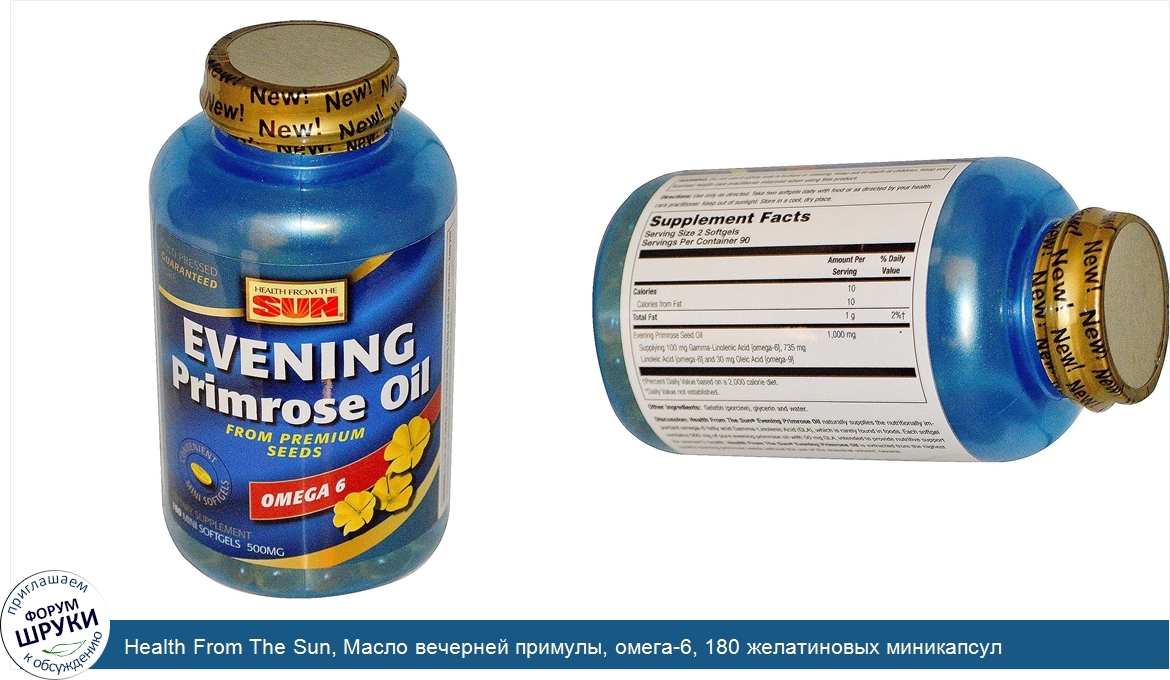 [DESCRIPT]New! Cold Pressed. Guaranteed Pure. From Premium Seeds. Convenient Mini Softgels. Dietary Supplement. Discussion: Health From the Sun Evening Primrose Oil naturally supplies the nutritionally important omega-6 fatty acid Gamma-Linolenic Acid (GLA), which is rarely found in foods. Each softgel contains 500 mg of pure evening primrose oil with 50 mg GLA, intended to provide nutritive support for women's health. Health From the Sun Evening Primrose Oil is extracted from the highest quality evening primrose seeds without the use of the chemical solvent, hexane. Rigorously quality tested to guarantee purity, potency and truth-in-labeling.[/DESCRIPT]... (описание дополняется)