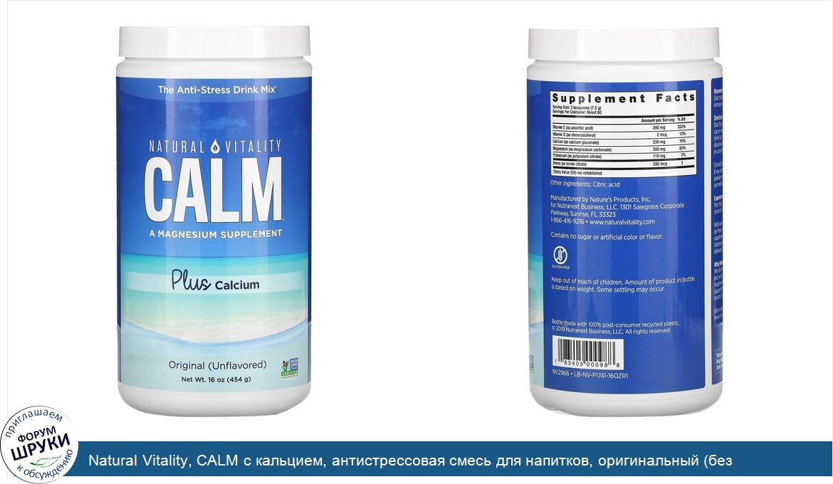 [DESCRIPT]The Anti-Stress Drink Mix. A Magnesium Supplement. Non GMO Project Verified. Gluten-Free. Experience Calm Plus Calcium:. You may notice muscles relaxing and an overarching sense of calmfulness. Multi-award-winning Natural Vitality Calm™, developed by Peter Gillham, is the best-selling magnesium supplement in the natural products market. (April 2019 Volume sales data for Natural Products market as defined by SPINS). Why Natural Vitality Calm™Plus Calcium? We all encounter stress daily whether we realize it or not, and our bodies can respond by depleting our magnesium levels. Natural Vitality Calm™ Plus Calcium supports healthy magnesium levels while being a good source of calcium. We invite you to help replenish your body's magnesium levels and enjoy the wave of calmfulness.[/DESCRIPT]... (описание дополняется)
