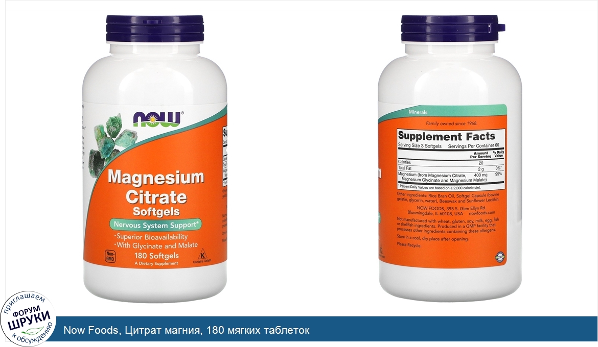 [DESCRIPT]Nervous System Support. Superior Bioavailability. With Glycinate and Malate. Non-GMO. A Dietary Supplement. Kosher. Contains Gelatin. Minerals. Family Owned Since 1968. GMP Quality Assured. Magnesium is a mineral that is critical for energy production and metabolism, muscle contraction, nerve impulse transmission, and bone mineralization. It is a required cofactor for an estimated 300 enzymes. Among the reactions catalyzed by these enzymes are fatty acid synthesis, protein synthesis, and glucose metabolism. Magnesium status is also important for regulation of calcium balance through its effects on the parathyroid gland. Magnesium Citrate is easily absorbed, and NOW® Magnesium Citrate Softgels are provided in a liquid base with chelated forms for superior bioavailability.[/DESCRIPT]... (описание дополняется)