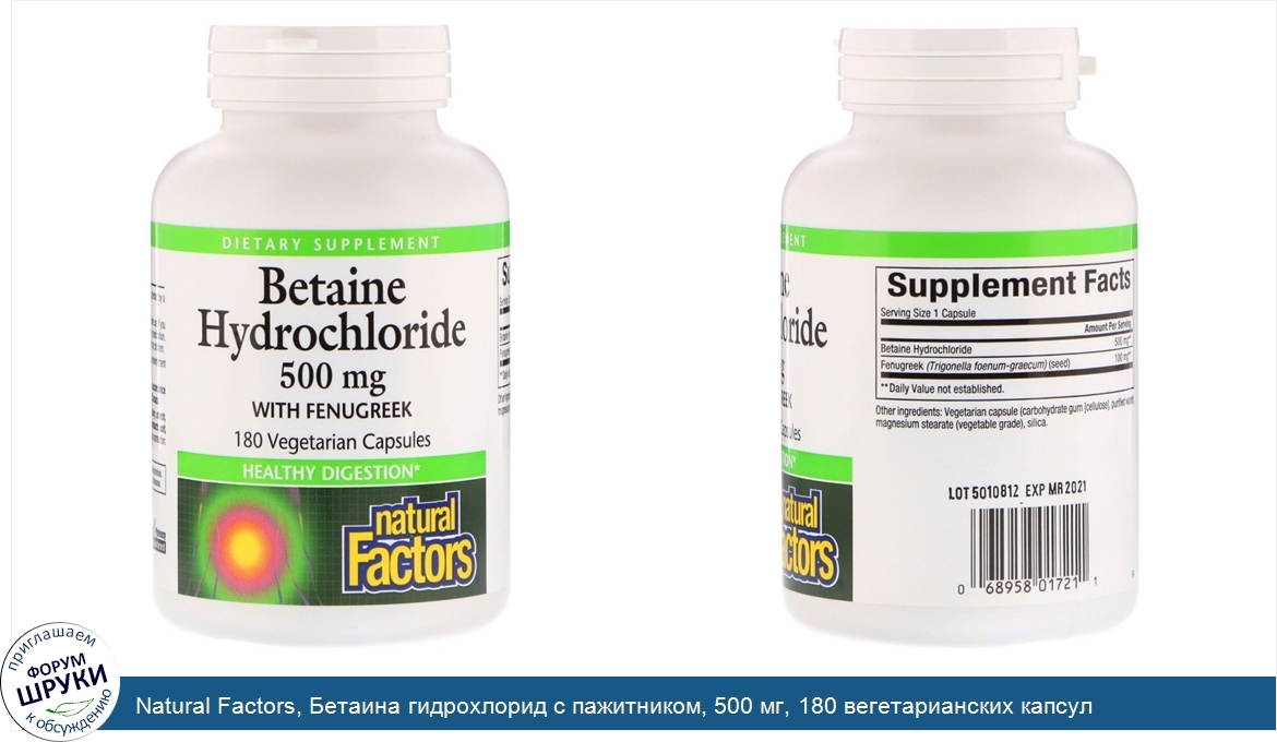 Друзья, если у вас есть отзыв/дополнение/комментарий/вопрос относительно Natural Factors, Бетаина гидрохлорид с пажитником, 500 мг, 180 вегетарианских капсул - напишите его ответом в эту тему (это будет полезно всему сообществу в целом и вам в отдельности).