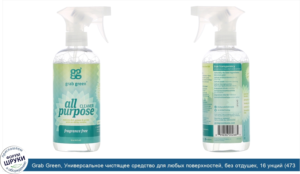 Друзья, если у вас есть отзыв/дополнение/комментарий/вопрос относительно Grab Green, Универсальное чистящее средство для любых поверхностей, без отдушек, 16 унций (473 мл) - напишите его ответом в эту тему (это будет полезно всему сообществу в целом и вам в отдельности).